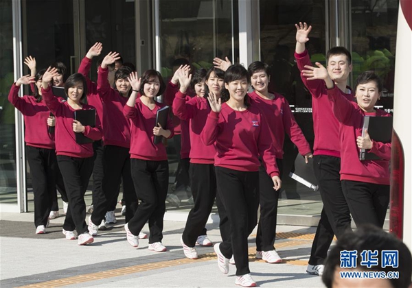 2月8日,朝鲜艺术团成员抵达韩国江陵艺术中心,为当晚的演出做准备。新华社发(李相浩 摄)