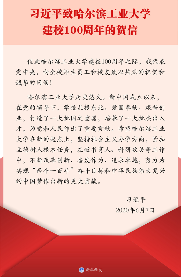 日期:2020-06-08 来源: 作者: 新华社北京6月7日电 中共中央总书记、国家主席、中央军委主席习近平7日致信祝贺哈尔滨工业大学建校100周年,向全校师生员工和校友致以热烈的祝贺和诚挚的问候。