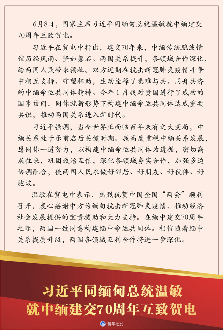 习近平在贺电中指出,建交70年来,中缅传统胞波情谊历经风雨、坚如磐石。两国关系提升,各领域合作深化,给两国人民带来福祉。双方近期在抗击新冠肺炎疫情斗争中相互支持、守望相助,生动诠释了患难与共、同舟共济的中缅命运共同体精神。今年1月我对贵国进行了成功的国事访问,同你就新形势下构建中缅命运共同体达成重要共识,推动两国关系进入新时代。