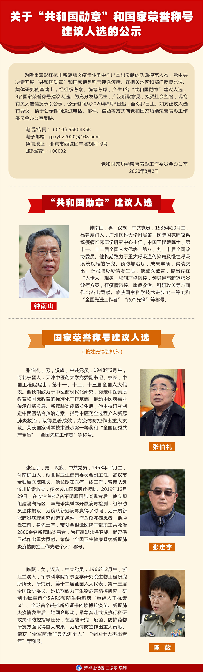 为隆重表彰在抗击新冠肺炎疫情斗争中作出杰出贡献的功勋模范人物,党中央决定开展“共和国勋章”和国家荣誉称号评选颁授。在相关地区和部门反复比选、集体研究的基础上,经组织考察、统筹考虑,产生1名“共和国勋章”建议人选,3名国家荣誉称号建议人选。为充分发扬民主,广泛听取意见,接受社会监督,现将有关人选情况予以公示,公示时间从2020年8月3日起,至8月7日止。如对建议人选有异议,请于公示期间通过电话、邮件、信函等方式向党和国家功勋荣誉表彰工作委员会办公室反映。