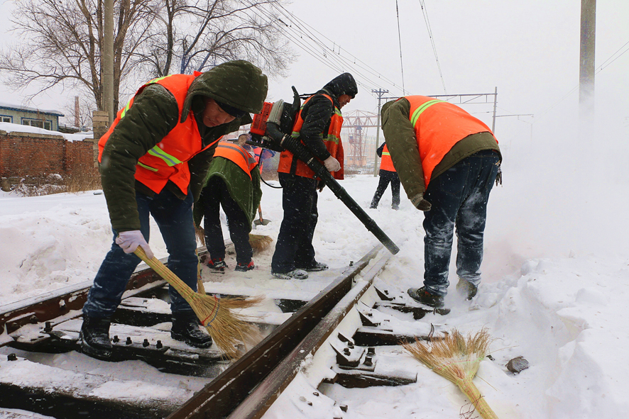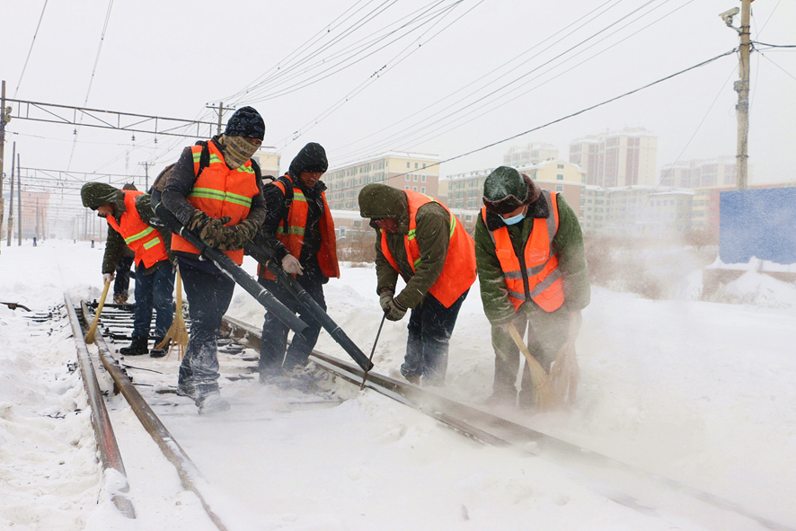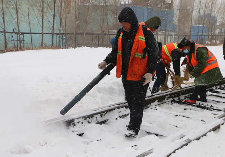 雪情就是命令!销售公司、运输部第一时间启动风雪天气应急预案,成立党政领导任总指挥的冬季除雪工作指挥部,划分包保责任区,层层落实责任,保证重点部位和关键作业项目安全。与此同时,矿铁运输、汽运、货场、质检等各系统分管领导、安全管理干部第一时间分赴矿铁沿线各车站、道口等包保片区,现场指导除雪工作,确保恶劣天气下行车和作业人员安全。机务段机车乘务员和车务段调车组等行车工种行车作业时严格执行《矿铁行车遇降雾暴风雨雪等不良天气时安全行车办法》规定,加强瞭望和鸣笛示警,预防铁路路外事故发生。矿铁沿线车务段、机务段、工务段等基层单位职工分班次24小时坚守在运输生产一线,密切协调、各司其责,及时清除道岔轨间的积雪,坚决做到雪不停、人不离、行车不中断,防止厚重积雪造成隐患,确保矿铁运输畅通无阻。