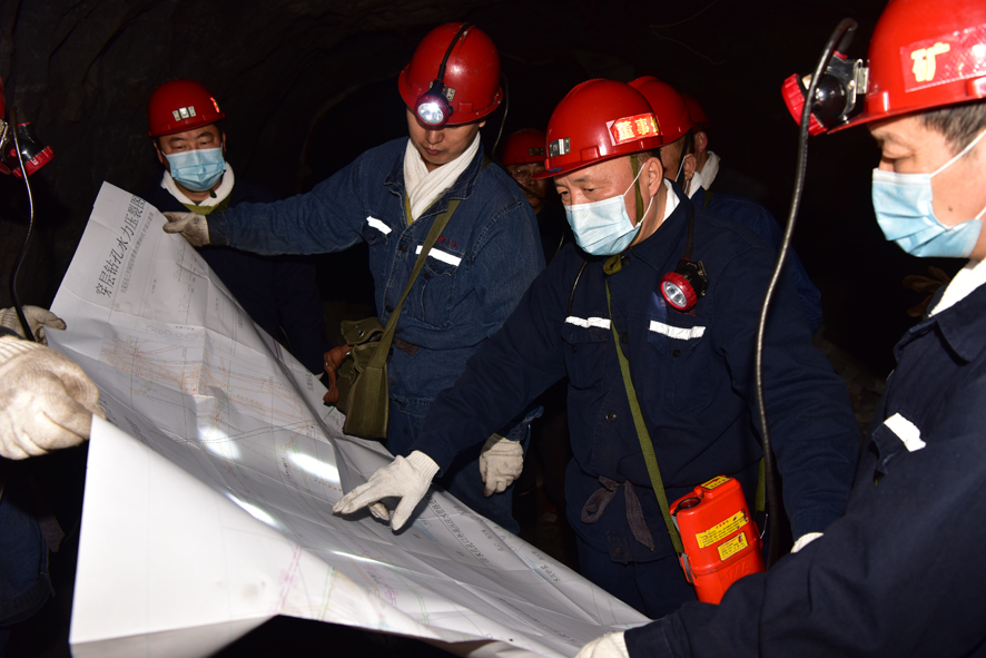 在新兴矿161采煤工作面上巷,张长山认真查看了58号煤层右三片水力压裂平面图,详细了解了冲击地压治理措施和履带式矿用清水泵站使用流程,与新兴矿现场管理人员深入探讨研究了灾害治理措施、煤层压裂注水技术。