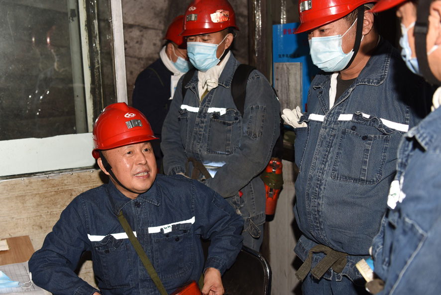 14时50分,张长山在新铁矿联合楼班前课会议室与上三班的职工共同上班前课,仔细询问了新铁矿“我为群众办实事”实践活动开展情况,征求职工对企业发展的意见和建议,深入井下检查了新铁矿领导干部入井带班交接班记录和综采工作面上下两巷维护、矿井压风自救装置完好情况,仔细查看了皮带连续化运输和喷雾消尘情况,与新铁矿602综采队队长付国鑫细算了应用采煤“一刀成”生产工艺后安全、生产效率、煤炭产量、职工增收等方面的经济账。