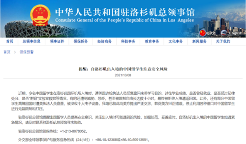 中国留学生入境美国遭恐吓 我驻洛杉矶总领馆发布提醒