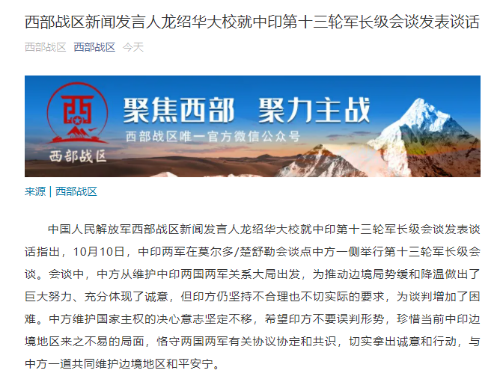 西部战区新闻发言人就中印第十三轮军长级会谈发表谈话