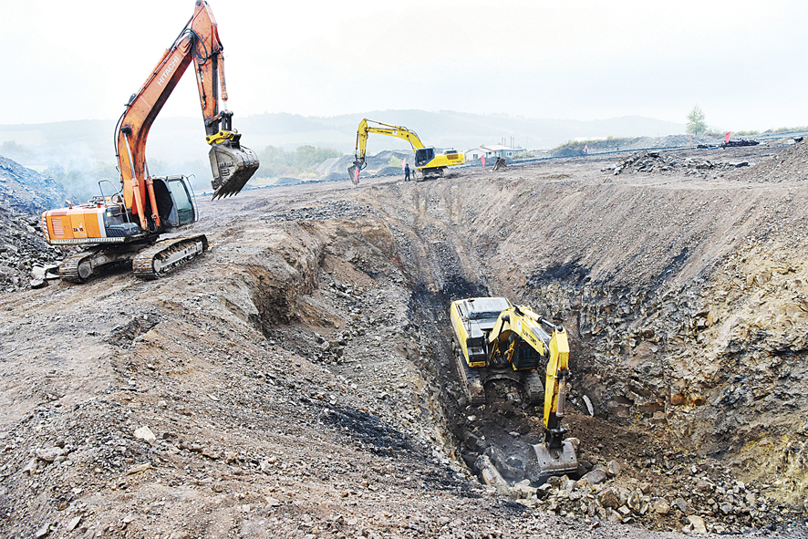 从8月28日开始,七峰煤矿出动17辆自卸车、4辆钩机、3辆铲车、1辆压道机、1辆推土机平整场地、垫道,所用矸石量达到5万立方米。