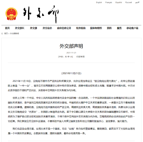 日期:2021-11-22 来源:七台河矿区新闻网 作者:新华社北京11月21日电 外交部21日发表声明,宣布决定将中立两国外交关系降为代办级。声明全文如下: