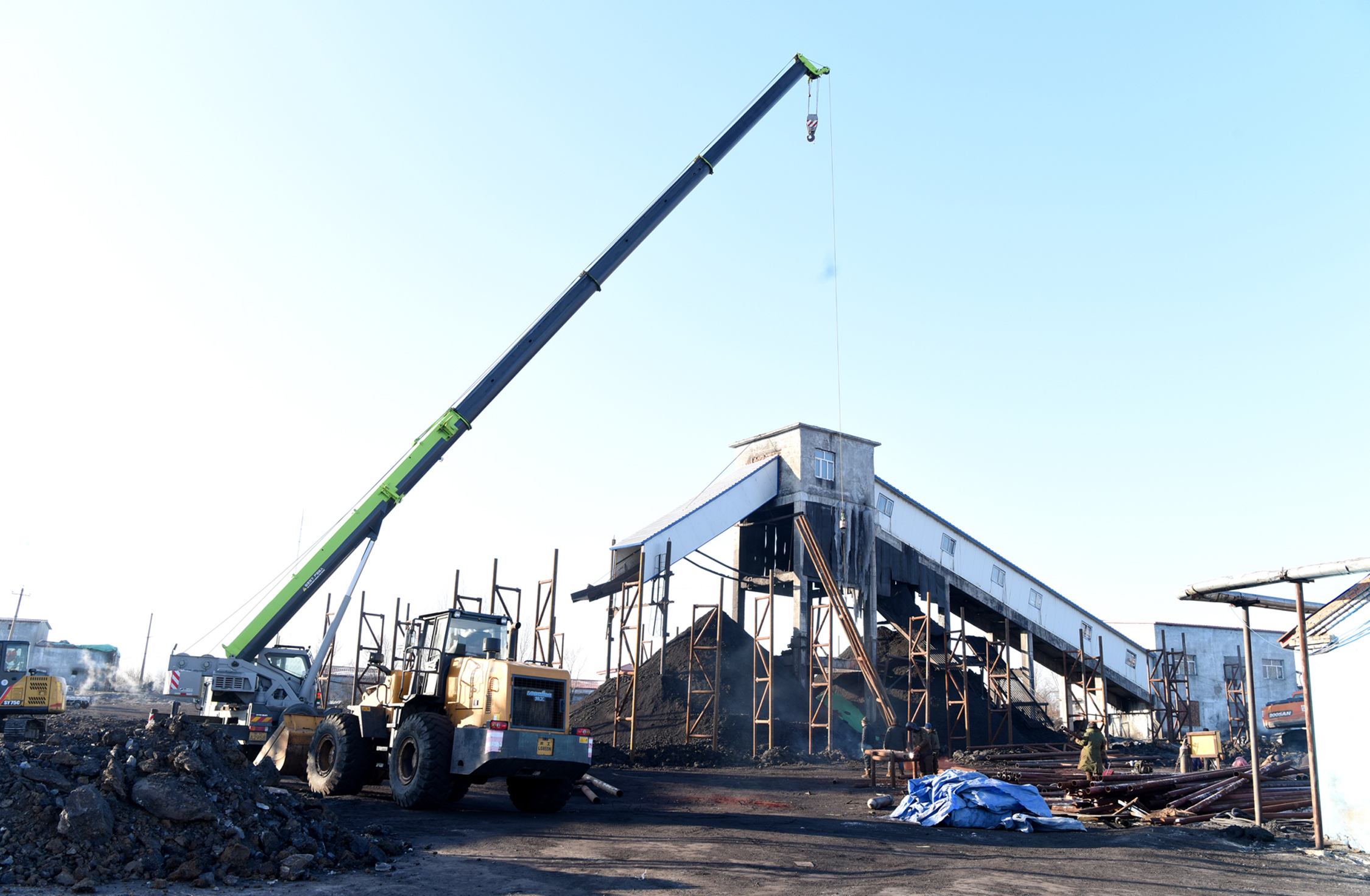 在施工现场,土建工程处广大工程建设者冒着零下25度的寒冷天气施工,塔吊、汽车等大型机械设备一刻不停地作业,正在快速有序推进施工。目前胜利矿二采一井的噪音、固体废物问题已全部解决,环保工程建设完工后,将有效解决扬尘的问题。(摄影:孙国祥)