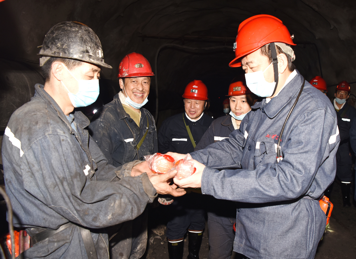 在7211掘进工作面,孙成坤详细了解了生产组织、新装备应用、单进水平等情况,与一线职工亲切握手、互致新春祝福。他说:“今天是大年初四,我代表集团公司党委、集团公司来看望你们,给你们拜年,祝你们新春快乐、阖家幸福。”