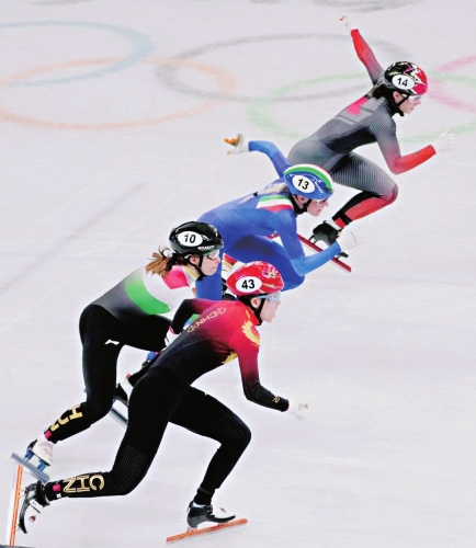 2月5日,中国队选手范可新(下)在比赛中出发。当日,在首都体育馆举行的北京2022年冬奥会短道速滑项目混合团体接力决赛中,中国队夺得冠军。 新华社记者王毓国 摄
