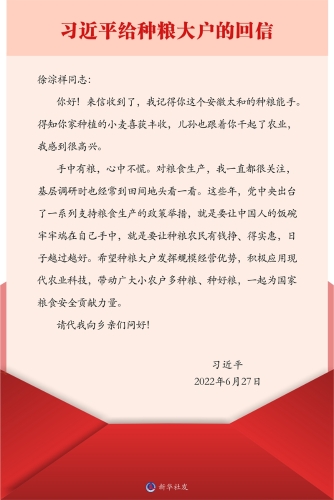 日期:2022-06-29 来源:新华社 作者:新华社北京6月28日电 中共中央总书记、国家主席、中央军委主席习近平6月27日给安徽省太和县的种粮大户徐淙祥回信,向当地的乡亲们表示问候,对全国的种粮大户提出殷切期望。