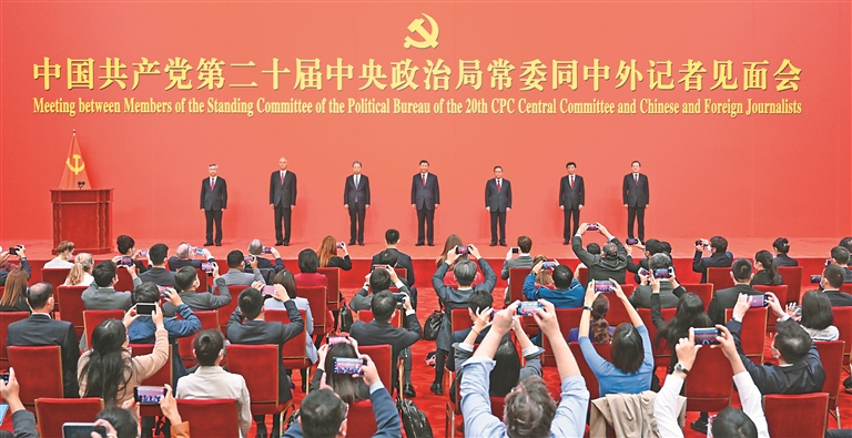 10月23日,刚刚在中国共产党第二十届中央委员会第一次全体会议上当选的中共中央总书记习近平和中共中央政治局常委李强、赵乐际、王沪宁、蔡奇、丁薛祥、李希在北京人民大会堂同采访中共二十大的中外记者亲切见面。新华社记者 申宏摄