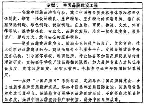 ——品牌建设取得更大进展。品牌培育、发展、壮大的促进机制和支持制度更加健全,品牌建设水平显著提高,企业争创品牌、大众信赖品牌的社会氛围更加浓厚,品质卓越、特色鲜明的品牌领军企业持续涌现,形成一大批质量过硬、优势明显的中国品牌。