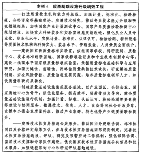 ——质量基础设施更加现代高效。质量基础设施管理体制机制更加健全、布局更加合理,计量、标准、认证认可、检验检测等实现更高水平协同发展,建成若干国家级质量标准实验室,打造一批高效实用的质量基础设施集成服务基地。