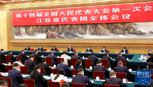 3月5日,中共中央总书记、国家主席、中央军委主席习近平参加他所在的十四届全国人大一次会议江苏代表团审议。新华社记者 黄敬文 摄