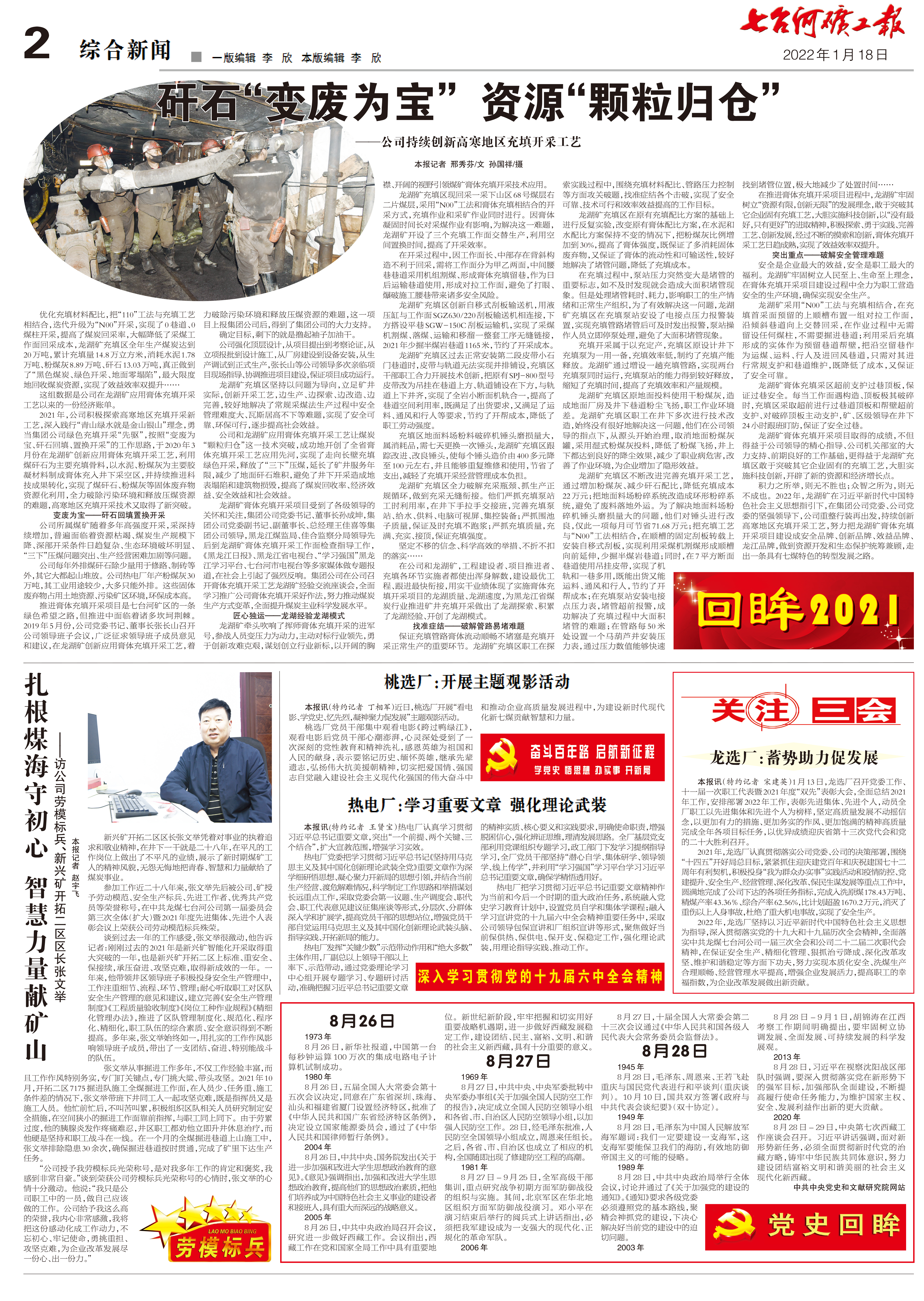 积力之所举,则无不胜也;众智之所为,则无不成也。2022年,龙湖矿在习近平新时代中国特色社会主义思想指引下,在集团公司党委、公司党委的坚强领导下,公司重整行装再出发,持续创新高寒地区充填开采工艺,努力把龙湖矿膏体充填开采项目建设成安全品牌、创新品牌、效益品牌、龙江品牌,做到资源开发和生态保护统筹兼顾,走出一条具有七煤特色的转型发展之路。