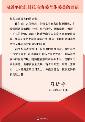 日期:2023-09-13 来源:新华社 作者:新华社北京9月12日电 中共中央总书记、国家主席、中央军委主席习近平9月11日给红其拉甫海关全体关员回信,对海关系统干部职工更好履行职责使命提出殷切期望。