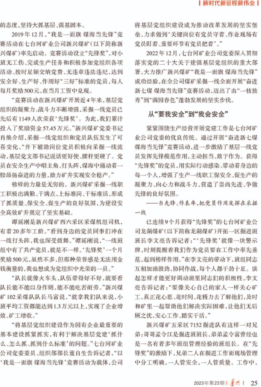 2022年12月,七台河矿业公司党委深入贯彻落实党的二十大关于建强基层党组织的重大部署,大力推广新兴煤矿“我是一面旗 煤海当先锋”成功经验,在全公司煤矿采掘一线全面开展“奋进新七煤 煤海当先锋”竞赛活动,迈出了由“一枝独秀”到“满园春色”蓬勃发展的坚实步伐。