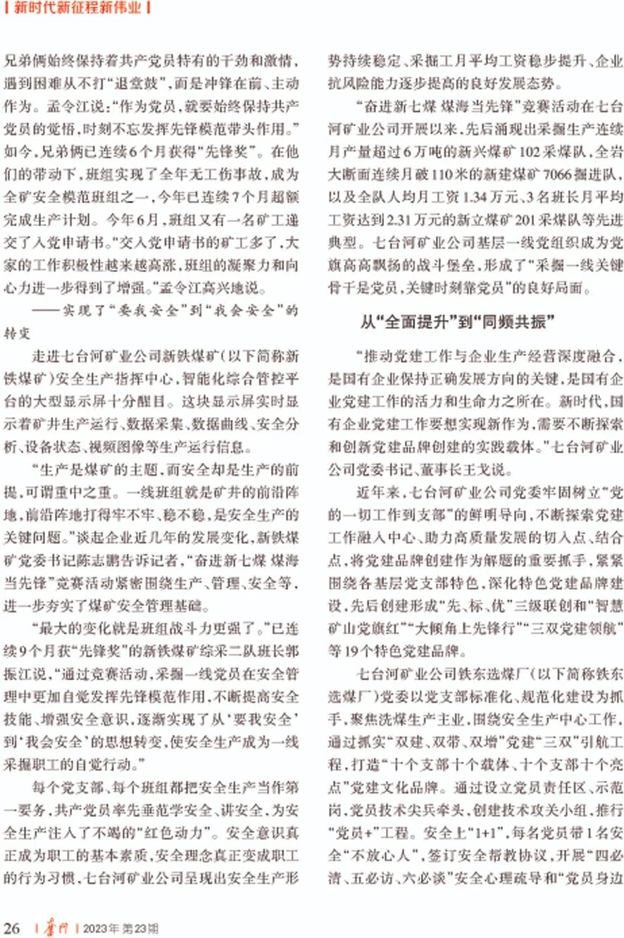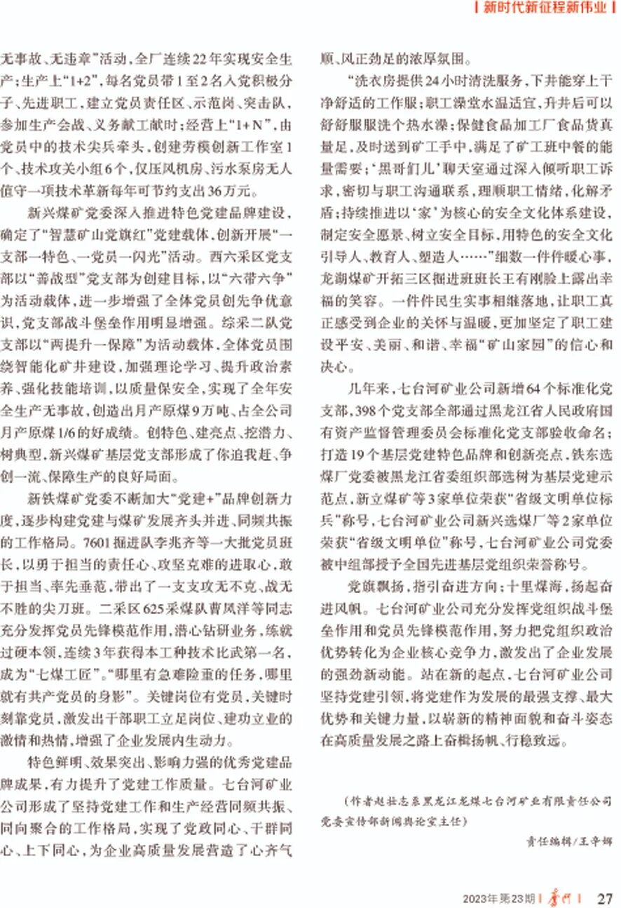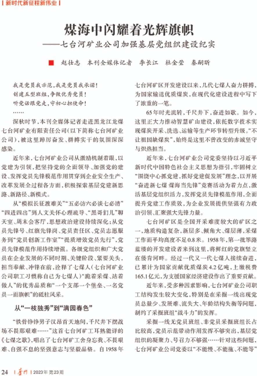 日期:2023-12-07 来源:《奋斗》 作者:赵壮志 本刊全媒体记者 李长江 杜金莹 秦嗣昕12月5日,中共黑龙江省委《奋斗》杂志2023年第23期新时代新征程新伟业栏目,刊发《煤海中闪耀着光辉旗帜——七台河矿业公司加强基层党组织建设纪实》一文。今天全文转发。 煤海中闪耀着光辉旗帜 ——七台河矿业公司加强基层党组织建设纪实 赵壮志 本刊全媒体记者 李长江 杜金莹 秦嗣昕