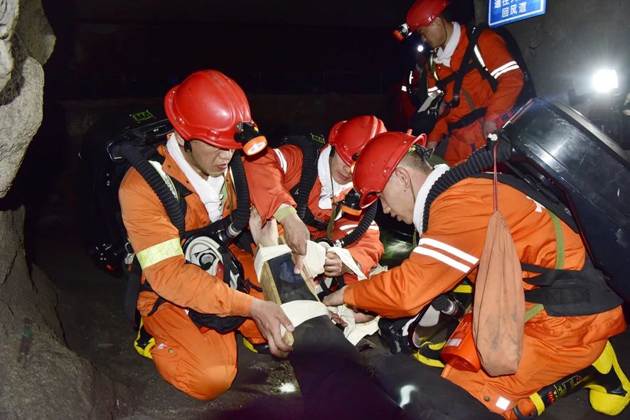 此次演练模拟场景是:“新兴矿立井西南侧积水区涌水通过58号煤层露头流入新兴矿井下,涌水又通过新兴矿六采区58号煤层采空区涌入下山区7163掘进队60号煤层右三片掘进工作面,7163掘进队人员发现险情按避灾路线撤离到二水平上部车场,有一名职工失联,救护人员现场侦查发现被困人员,按指挥部指令营救出被困人员”,按照接警、撤人、汇报、下达救援指令、集结、各专业组开展救援工作和救护队员营救出遇险人员送治等应急演练流程展开。