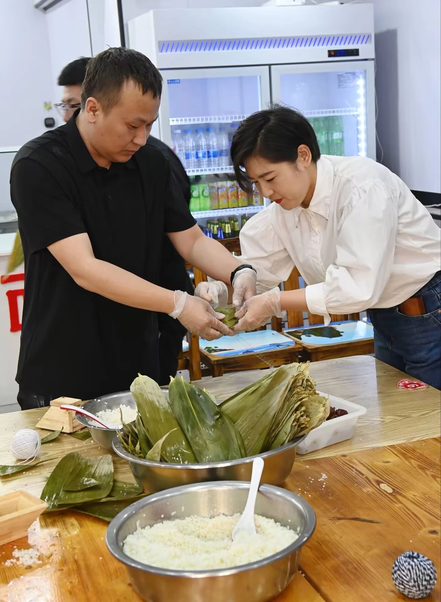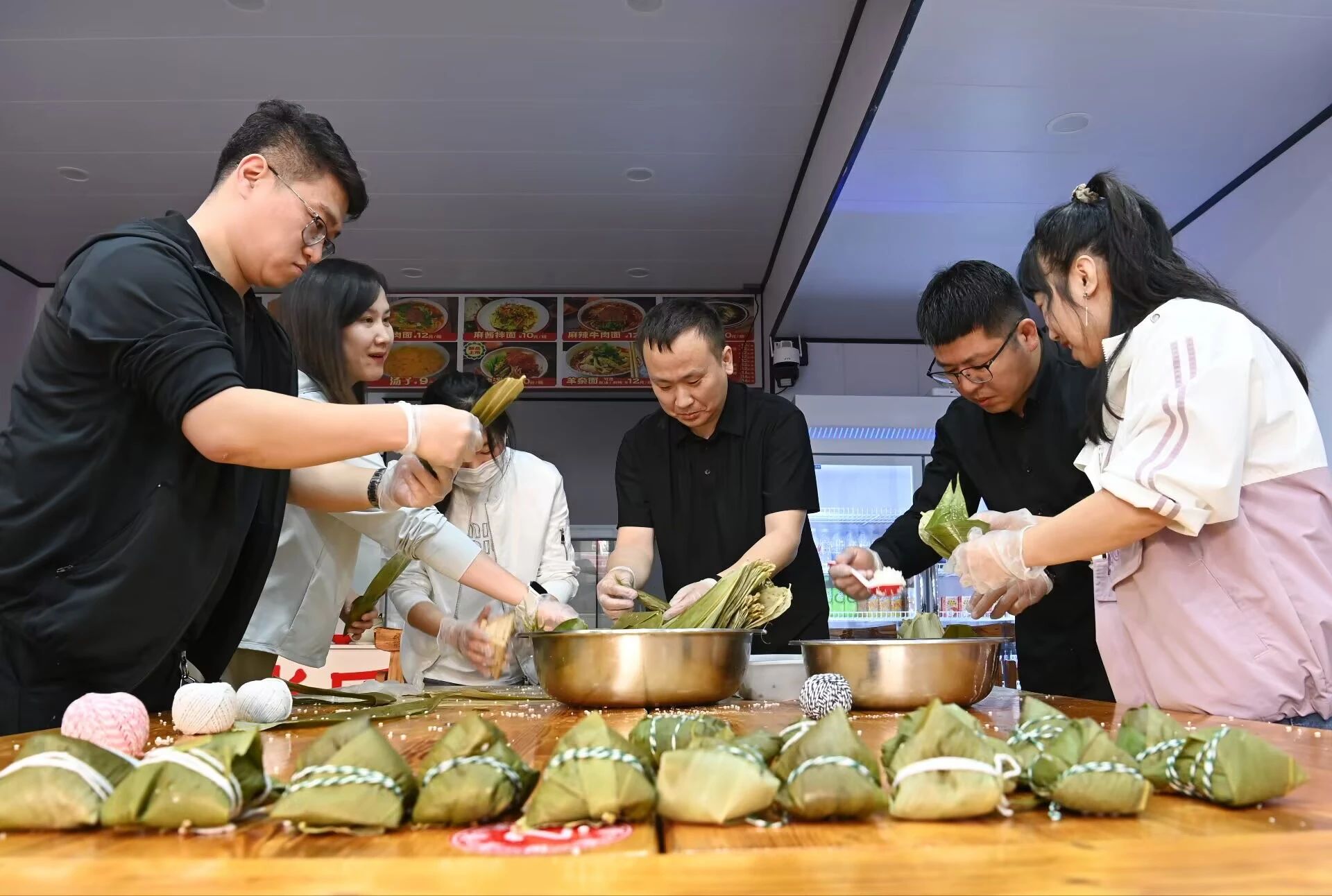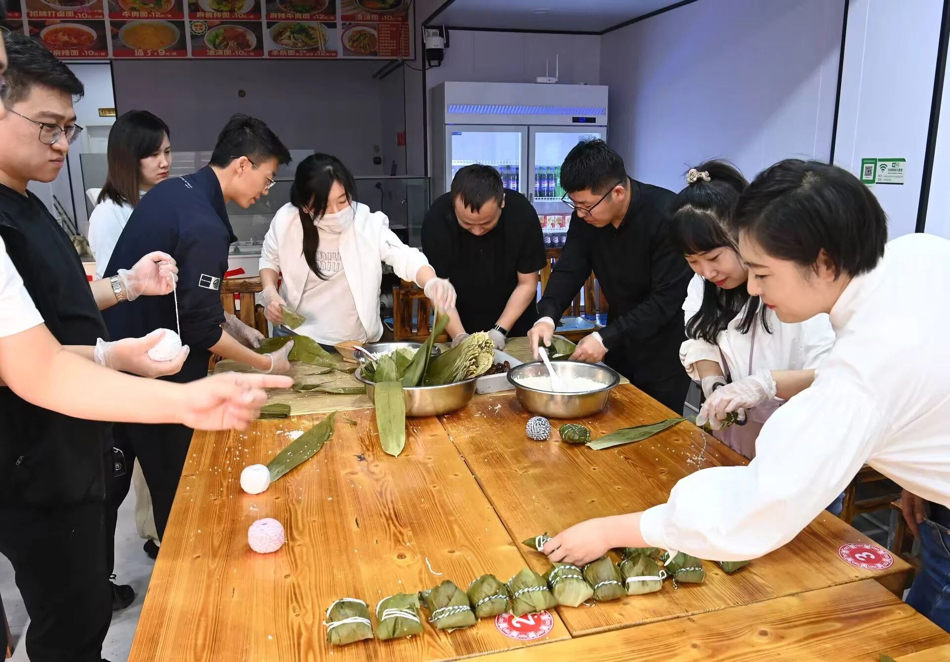 公司团委精心挑选优质的糯米、新鲜的粽叶、香甜的蜜枣等食材,为包出美味的粽子做好充足准备。经验丰富的团干部迅速进入状态,只见他们手法娴熟,粽叶在手中上下翻飞,三两下便折出一个漏斗形状,舀入适量糯米,再放入蜜枣等馅料,最后巧手一裹、一扎,一个棱角分明的粽子就成型了。一旁的新手不甘示弱、虚心请教,包出的粽子形状各异。他们一边包粽子,一边交流技巧,在欢声笑语中一个个饱满的粽子展现在面前。蒸煮完毕,热气裹挟着浓郁的粽香,将节日的氛围烘托得愈发浓厚。