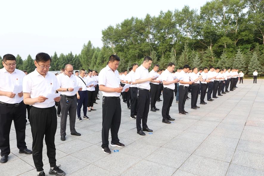 “我志愿加入中国共产党,拥护党的纲领……”在鲜红的党旗前,新建矿党员干部举起右拳,重温入党誓词,铿锵有力的誓言在革命烈士陵园广场久久回响。