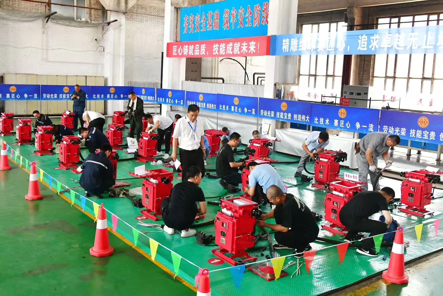 来到机电总厂电修车间,“匠心铸就品质,技能成就未来”、“岗位建功新时代、争创一流展风采”的条幅格外显眼。作为井下电钳工实操比赛区,这里没有平日生产时的喧嚣,三排防爆开关整齐地摆放在车间中央,参赛人员拿着扳手全神贯注地拆卸防爆开关,接线、拧紧螺丝,操作过程娴熟。“这次比赛意义非凡。”一名公司参赛职工边操作边说:“能在矿工节前夕代表我们矿参赛,是荣誉,更是责任。”汗水顺着他的安全帽带滑落,在布满老茧的手背上溅起细碎的水花,他手中的扳手每一次推拉都精准有力,金属屑在阳光下闪烁着细碎的光芒。身旁的一名年轻职工在检查工件时说:“比赛不是目的,提升技能、保障井下安全才是真本事。”