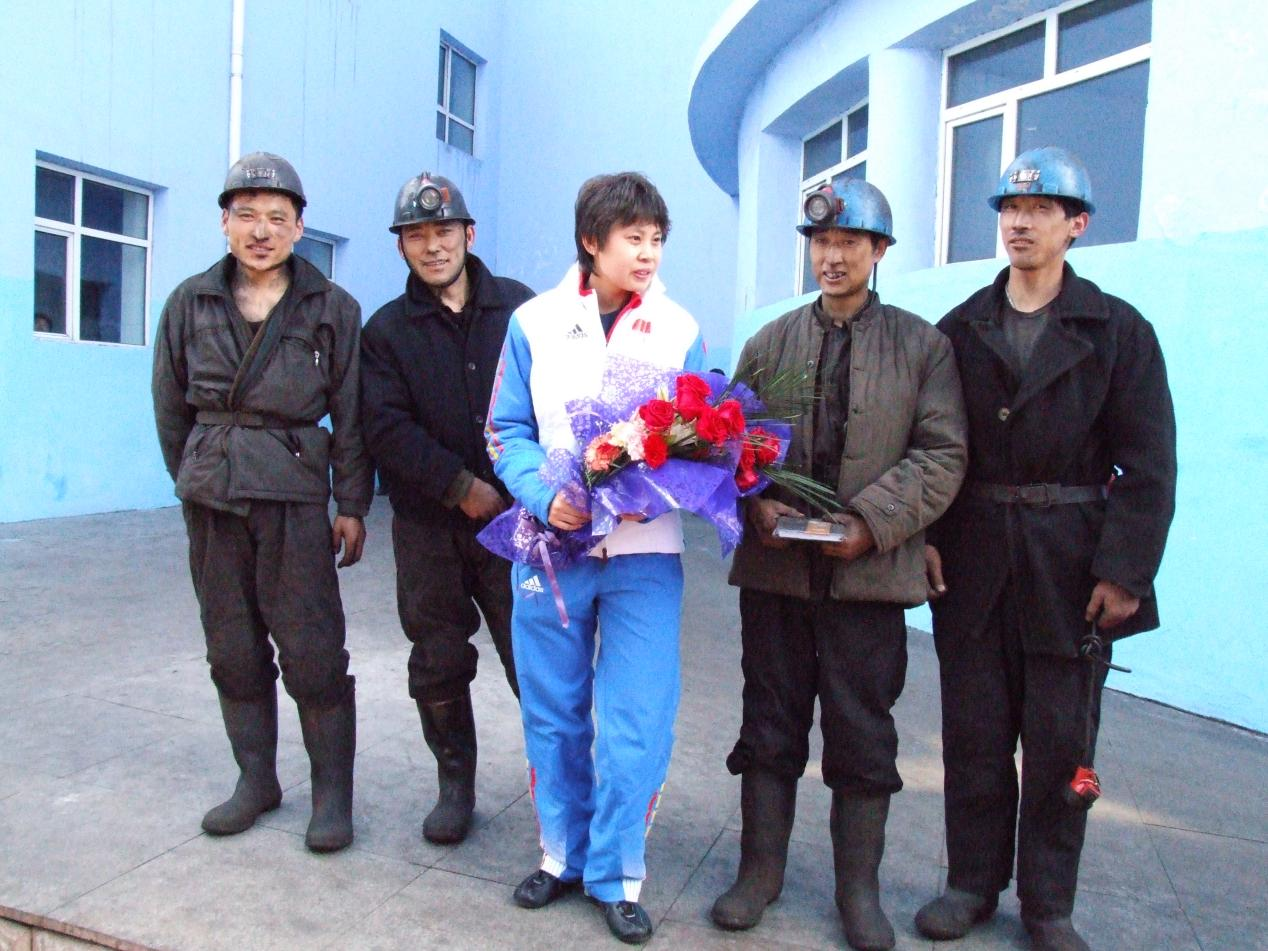 面向全球媒体记者自豪称自己是中国“矿工女儿”的冬奥冠军王濛和矿工们在一起。耿闻摄影